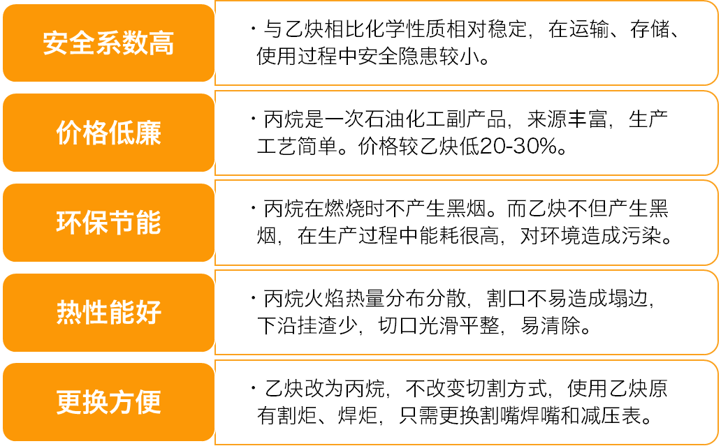 在切割焊接等工藝中,丙烷和乙炔都是常用的可燃?xì)怏w。然而在具體實(shí)踐中,丙烷因其安全、綠色、高效、性價(jià)比高等特點(diǎn),逐漸成為工業(yè)用戶的首選氣體,大有取代乙炔之勢(shì)。與乙炔等氣體相比,丙烷具有多種優(yōu)勢(shì):